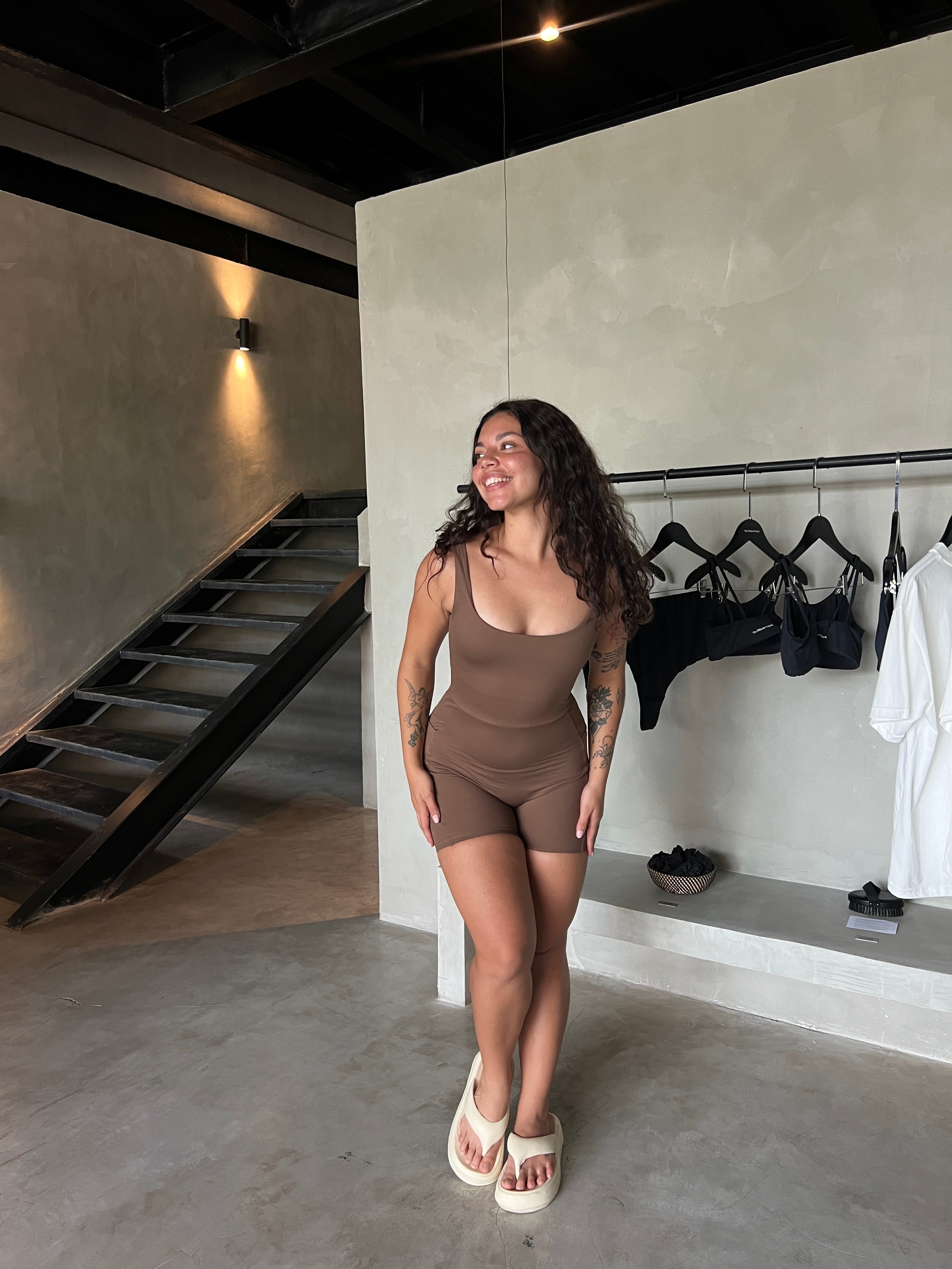 Olivia Square Neck Onesie | Recycled Polyester | Mocha